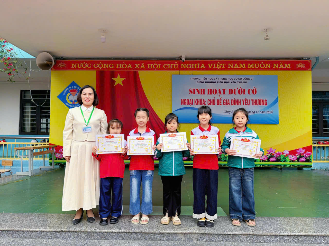 Sau nghi lễ chào cờ đầu tuần, đồng chí Nguyễn Thị Kim Cúc – Phó Hiệu trưởng, phụ trách điểm trường Tiểu học Yên Thanh, đã triển khai nhiệm vụ trọng tâm tuần; đồng thời trao giấy khen cho các tập thể lớp đạt thành tích thi đua dẫn đầu trong tháng 11.